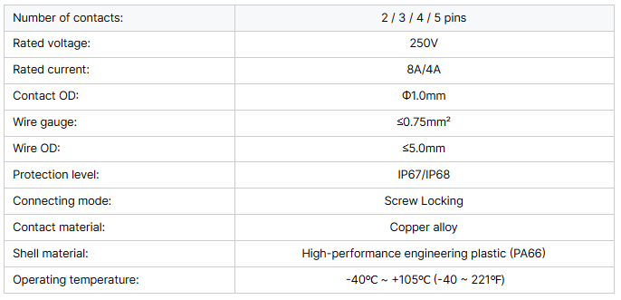 Robust Environmental Sealing: Achieves an IP67 protection rating, ensuring the connector is totally dust-tight and can withstand immersion in water up to 1 meter for 30 minutes.